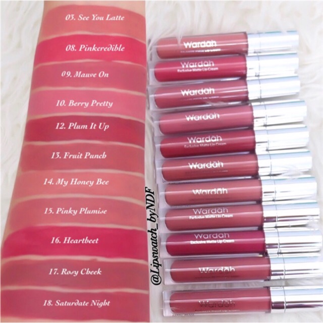 Wardah Exclusive Matte Lip Cream terdiri dari warna warna yang normal seperti pink merah hingga nude Produk lip cream ini memberikan hasil akhir matte namun tidak cracky atau pun membuat bibir kering Wajar saja lip cream dengan warna memukau dan tahan lama ini kan mengandung jojoba oil vitamin E dan squalane yang bisa menutrisi bibir